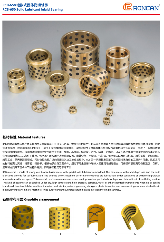 The RCB650 is a universal basic product, regardless of high pressure, low pressure, high temperature, low temperature, oil lubrication, oil free lubrication or water lubrication. All can be applied. The matrix of the product is high force brass, which is twice as hard as the ordinary copper sleeve. The wear resistance is more than doubled. Therefore, it can be used in continuous casting machines, rolling mills and conveyors in the metallurgical industry. Also used in plastic injection molding machine mold locking mechanism, extrusion mechanism. The automatic switch of high voltage electricity, the lifting support part of construction machinery, and the arc door support of water conservancy project. Pulley and drive wheel parts. There are paper machine drying track, automobile mold, ship anchor sliding parts, etc.